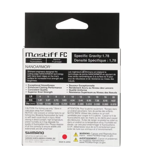 FabriquĂ© au Japon avec un contrĂŽle qualitĂ© strict, le Shimano Mastiff FC est un fil 100% fluorocarbone qui offre aux pĂȘcheurs cohĂ©rence et fiabilitĂ© avec force, durabilitĂ© et douceur pour amĂ©liorer les performances sur lâeau. Mais les avantages du Mastiff ne se limitent pas Ă une douceur et une souplesse accrues, la caractĂ©ristique la plus importante du Mastiff ne se voit pas Ă lâĆil nu. Les ingĂ©nieurs de Shimano ont mis au point la technologie NANOARMORÂź â des stries de taille nanomĂ©trique sur la surface extĂ©rieure du fil â pour amĂ©liorer la rĂ©sistance des nĆuds et la robustesse, empĂȘchant le glissement et rĂ©duisant le risque de rupture du fil. La rĂ©sistance des nĆuds et la durabilitĂ© sont essentielles pour supporter le stress rĂ©pĂ©titif lors du lancer, du twitching ou du jerking de gros leurres. DĂ©veloppĂ© dans un seul but : Mastiff offre une confiance connectĂ©e sur lâeau.